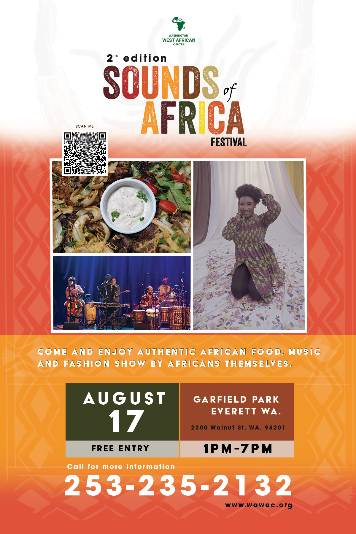 Remember, it’s the Sounds of Africa Festival 2.0, scheduled to take place at Garfield Park (2300 Walnut St, Everett, WA 98201) on Saturday, August 17th, from 1 PM to 7 PM.