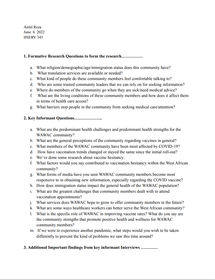 UW Seattle Student Anfel Reza project on Health Assessment needs interview from Health Systems and Population Health Class (HSERV 345) 2022: