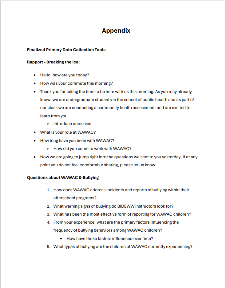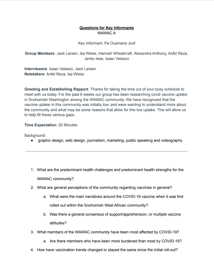 UW Seattle Student’s Jack Larsen, Isa Weiss, Hannah Wheatcraft, Alexandra Anthony, Anfel Reza, Jeriko Leso, and Isaac Velasco project on Health Assessment needs interview “Primary Data Collection Tool” from Health Systems and Population Health Class (HSERV 345) 2022: