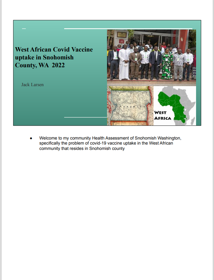 University of Washington Bachelor of Nursing students (Bubacarr Danso, Gelma Mile, Jarrai Gassama, Yewebdar Ashagre), Bothell Campus Population-Based Health Community Practice (BNURS 424) guided by professor Dr. Anna Winquist, MN, RN, PhD 2022: